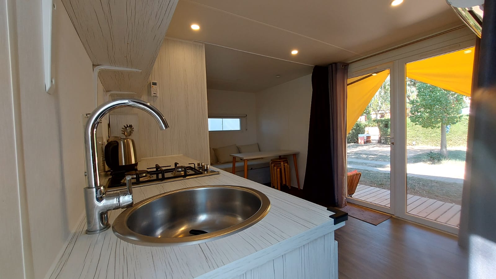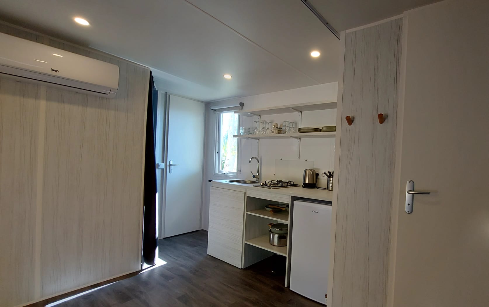 Enjoy campsite life, but from the comfort of your own mobile home. A nice way to alternate the pleasant bustle of our campsite with the peace and privacy of your own spot. Fully equipped with a kitchen, living room, shower and separate toilet and 2 bedrooms. Everything is ready for you, so all you have to do on arrival is unpack your suitcase.